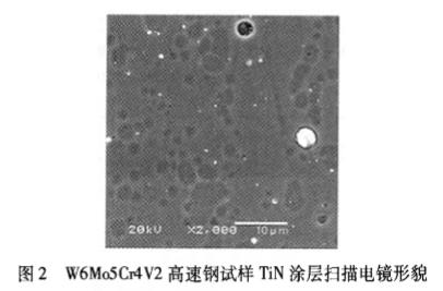 圖2為W6M05Cr4V2高速鋼試樣涂層的表面形貌,涂層橫截面厚度為3.2um。由圖2可見,TiN膜層均勻、致密,涂層表面平滑,Ti滴(白色)數(shù)量少,并且顆粒大多數(shù)較細(xì)小。照片中黑色陰影應(yīng)是沉積時(shí)離子轟擊致使液滴脫落而留下的痕跡。液滴數(shù)量少及液滴尺寸小,有利于提高TiN涂層的表面硬度及致密性,從而提高涂層的耐磨性及氧化抗力。