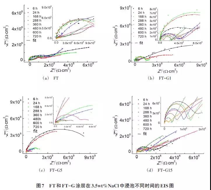 當(dāng)石墨烯含量達(dá)到0.15wt%時(shí),整個(gè)實(shí)驗(yàn)過程中,Nyquist圖均為高頻容抗弧和低頻Warburg阻抗的組合,這一方面是由于含量較高的石墨烯發(fā)生了團(tuán)聚,另一方面則因?yàn)槭┑谋缺砻娣e很大,當(dāng)其含量較高時(shí),其吸油量很大,樹脂不能很好覆蓋和浸潤石墨烯,使涂層中的孔隙等缺陷增多,溶液向涂層內(nèi)部的滲透通道增加,導(dǎo)致溶液的擴(kuò)散速率增大,金屬腐蝕較快,在浸泡168h時(shí)即出現(xiàn)銹點(diǎn)。因此,在氟碳樹脂中添加適量石墨烯時(shí),柔韌性良好的石墨烯與樹脂分子鏈相互作用,層狀疊加的石墨烯延長(zhǎng)了腐蝕介質(zhì)的傳輸通道,使涂層力學(xué)性能和屏蔽性能得到增強(qiáng),但是過量的石墨烯增加了涂層缺陷,反而不利于金屬的腐蝕防護(hù)。