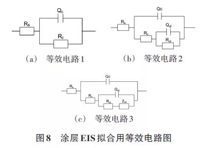 采用圖8所示的等效電路作為物理模型對(duì)EIS圖進(jìn)行擬合分析,可以得到溶液電阻Rs、涂層電容Qc、涂層電阻Rc以及涂層下金屬腐蝕反應(yīng)的電荷轉(zhuǎn)移電阻Rct、雙電層電容Qdl等信息,另外當(dāng)出現(xiàn)擴(kuò)散尾時(shí)引入Warburg阻抗Zw來擬合。擬合發(fā)現(xiàn),對(duì)于FT涂層和FT-G1復(fù)合涂層,在6~168h階段、288~720h分別用圖8(b)和圖8(c)中的等效電路進(jìn)行較好的擬合,而FT-G5涂層EIS圖在6~288h和360~720h階段分別用圖8(a)和圖8(b)進(jìn)行擬合,F(xiàn)T-G15用圖8(c)所示電路擬合較好。由于涂層電阻(Rc)和電荷轉(zhuǎn)移電阻(Rct)可用來表示涂層對(duì)金屬基體的防護(hù)性能,因此通過分析Rc和Rct來研究涂層的防腐蝕性能。