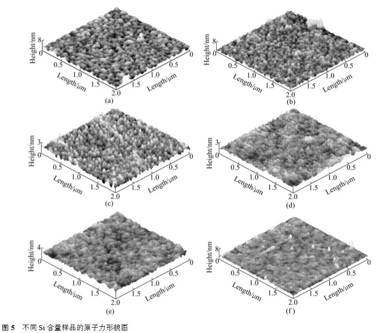 圖5所示為不同Si含量TiSiN薄膜的三維原子力顯微鏡圖。隨著Si含量的增加,薄膜的表面形貌和粗糙度(見表1)發生了明顯的改變。根據XRD和XPS結果的分析,結合所得的薄膜微觀結構可知,開始少量的Si溶入TiN晶格形成固溶體,薄膜表面仍是柱狀晶生長形成的晶粒凸起(見圖5a~c),隨著Si含量的進一步增大,形成的 Si3N4 非晶相的增加,附著在晶粒表面,阻礙了晶粒的進一步增大,同時填補了表面晶粒凸起間的凹坑,使得薄膜表面變得更加平滑(見圖 5(d)~(f))。這與已有的研究結果一致。