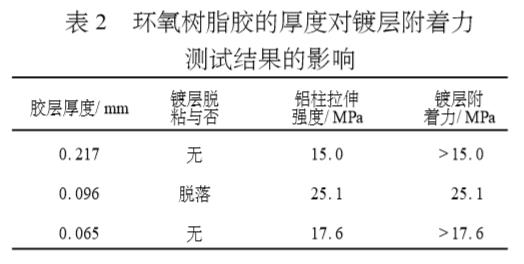 3.1 膠粘劑品種膠粘劑品種的選擇對于鍍層附著力的測試結果有重要的影響。膠粘劑選擇不當,鍍層根本不發生脫落,如選用的不飽和聚酯膩子和單組分聚氨酯清漆,拉伸時破壞均表現為膠層脫落,而鍍層不出現脫落現象。這表明鍍層的附著力遠大于對粘鋁柱的粘接強度。環氧樹脂具有優異的粘接性能,低分子聚酰胺固化的環氧具有較好的韌性,因此選擇651低分子聚酰胺固化E-51環氧膠粘劑體系。使用這種環氧膠粘劑對鍍層進行粘接,能夠使對粘鋁柱拉伸時鍍層脫落。這表明膠粘劑的粘接強度與鍍層的附著力基本相等。分別用不飽和聚酯膩子、單組分聚氨酯清漆和環氧膠粘劑粘接鍍層并測附著力,結果見表1。