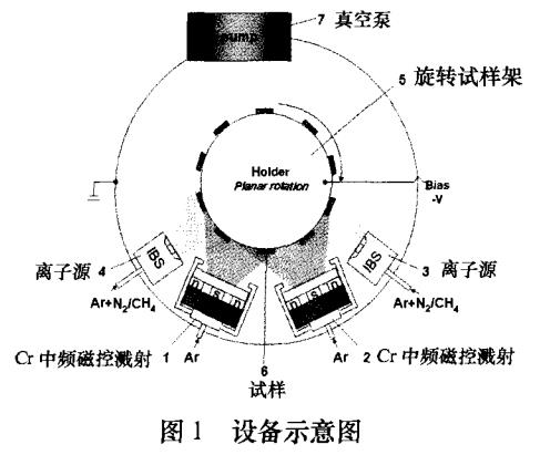 試驗所用鍍膜設備為北京丹普公司生產(chǎn)的ASM600DMTG型多功能離子鍍膜機。如圖1為設備示意圖,中頻攣生磁控濺射靶為TwinMagⅡ,采用AE公司中頻電源(40kHz),離子源為長條狀無燈絲離子源(IBS)。爐內(nèi)采用加熱棒進行加熱,公自轉(zhuǎn)工件架上可施加偏壓。沉積過程經(jīng)過編程由電腦全自動控制。