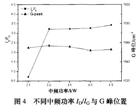 圖3為不同中頻功率沉積Cr-DLC的拉曼光譜分析。圖中樣品拉曼譜具有明顯的類金剛石譜線特征。G峰在1550cm附近,對應石墨相C-C鍵,隨中頻功率減小向高波數(shù)位移;D峰為肩峰在1350cm-1附近,對應無序sp3碳鍵。拉曼光譜對應同種原子的非極性鍵振動,中頻功率低則減小了膜層中Cr的含量,碳碳鍵相對含量增加使拉曼譜散射強度提高。G峰在1550cm-1附近表明鍵角寬化,sp3與sp2雜化鍵混合存在。類金剛石中sp鍵減小,則拉曼譜中G峰向高波數(shù)位移同時ID/IG比值增大。采用高斯擬合得樣品ID/IG與G峰位置如圖4,隨中頻功率提高,ID/IG增大且G峰向低波數(shù)略有位移,則隨中頻功率減小膜層中sp3增多。但3kW以后摻入的Cr量對C-C鍵影響不大。