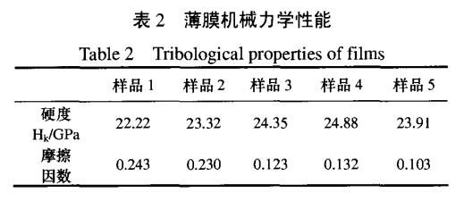 采用球盤摩擦磨損試驗機在大氣環(huán)境下測試膜層摩擦性能,摩擦副為軸承鋼,載荷300g,旋轉(zhuǎn)半徑3mm,轉(zhuǎn)速500r/min,測試時間20min。MD-5型努氏硬度計測量膜層硬度,載荷為25g,保載時間15s。WS-97涂層附著力劃痕試驗機劃痕,劃痕試驗采用最大載荷100N,加載速度100N/min,劃痕速度4mm/min。同時,采用Rockwell-C壓痕邊緣的裂紋擴展及膜層脫落對附著性能進行分級(壓力載荷為1500N)。