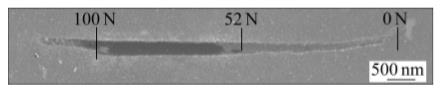 圖5所示為在Ti6Al4V基體鍍DLC/WC膜層測量膜基結(jié)合力的劃痕形貌。由圖5可見,所沉積的膜層與較軟(300HV)的Ti6Al4V基體結(jié)合良好,劃痕邊緣沒有明顯的崩膜,到52N后才露出基體,也就是膜基結(jié)合力達到了52N,達到工業(yè)應(yīng)用離子鍍TiN薄膜的膜/基結(jié)合水平。