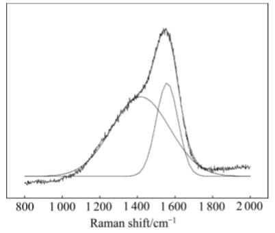 圖6所示為DLC/WC膜層的Raman光譜。主峰(G峰)位置均位于1560cm−1附近,對應(yīng)石墨相C—C鍵,肩峰(D峰)位置均位于1300~1400cm−1,對應(yīng)無序sp3碳鍵。經(jīng)分峰分析,其D峰強度與G峰強度的比值(ID/IG)為2.26,相對于純DLC膜的ID/IG一般較小,且ID/IG越小,sp3鍵越多的結(jié)果來說,該比值較大,這可能是由于在DLC層中間插入了WC層的影響所致,但還是明確顯示出典型的類金剛石膜特征峰。