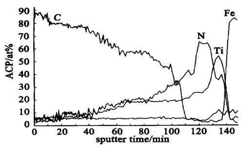 ?。?)制備的膜層成分深度分布與所設計的基體/Ti/ TiN/ TiCN/ TiC/ Ti-DLC相吻合。