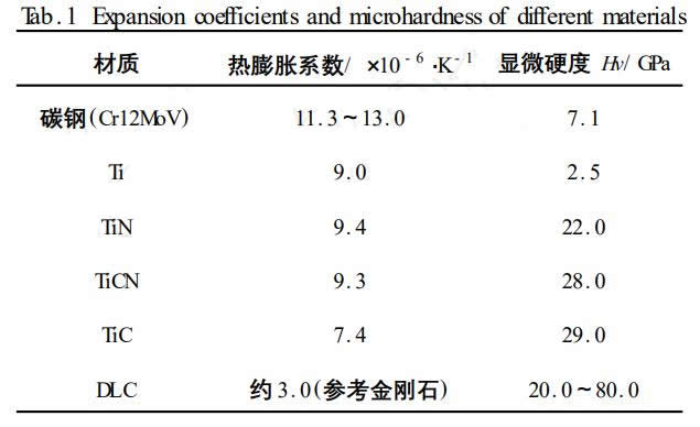 膜/基間熱膨脹系數相差越大,膜層間的殘余應力也就越大,膜/基結合力就越低,其適應寬溫差環境的能力也就越差。因此,在各種基體上沉積DLC薄膜時采用逐漸降低膜/基之間熱膨脹系數差及硬度差梯度過渡的方法,減少界面突變,提高結合強度(過渡層中各種材料的熱膨脹系數及硬度見表1)。本文在Cr12MoV模具鋼及單晶Si片基體上,采用了基體/Ti/TiN/TiCN/TiC/DLC梯度過渡的制備思路,分析結果與所設計的非常吻合,并獲得了良好的膜/基結合強度。在鋼基體上沉積2.9μm的Ti-DLC膜所測得的結合力為44N-74N。