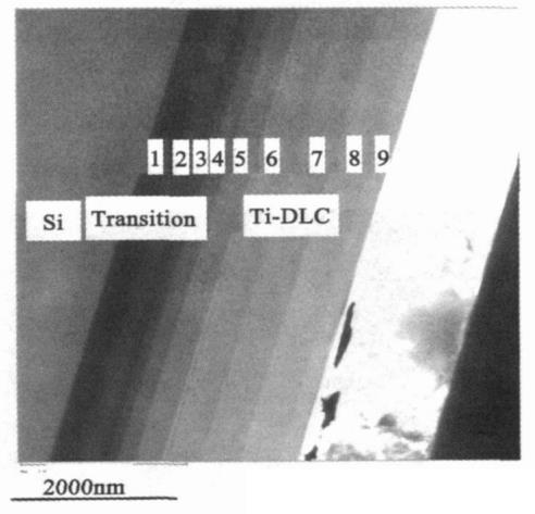 圖2是Ti-DLC/Si橫截面TEM圖。從圖中可明顯觀察到Si基體、梯度過渡層及DLC膜層,并可清晰地分辨出過渡層的梯度(1~3層,Ti層非常薄,圖中分辨不出)及摻鈦DLC膜層的梯度(4~9層)。膜層總厚度約2.9μm,顯微硬度Hv0.025,15=25.77GPa。