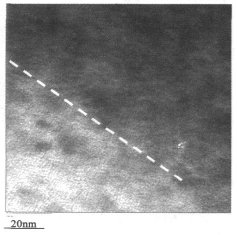 圖3是基體(Si)與膜層之間界面。由圖可見:左上角為(100)單晶Si基體,其晶格像明顯,而且對右下角的過渡層(主要為TiN)晶體顆粒的取向有一定的導向作用;其界面也可分辨且結合良好。