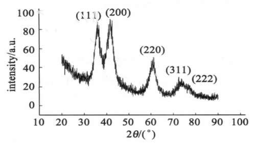 式中:λ為X射線波長=0.154056nm,B為衍射峰半峰寬=2.42°,忽略內應力及多相疊加的影響,可計算出(111)面薄膜生長的晶粒尺寸為3.45nm。這與透射電鏡測到的在非晶碳膜中彌散著約5nm的納米晶顆粒非常吻合。