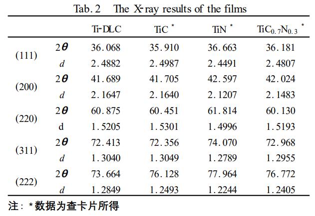 由上表可知:薄膜中的晶格常數更靠近TiC相。結合對膜層深度成分的分析,膜層中不僅含有過渡層的TiN、TiCN、TiC相,而且在非晶類金剛石膜中含有相當多的納米晶TiC相。