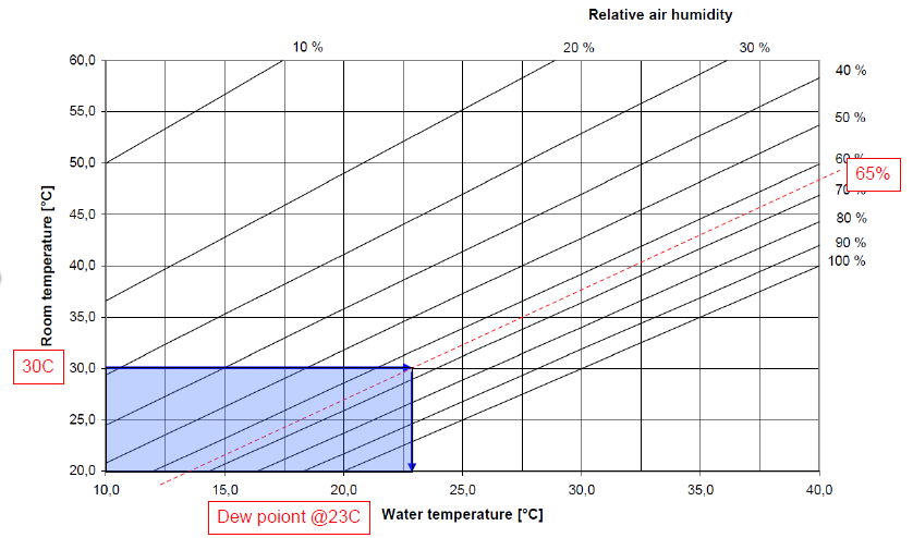 例如:當環境溫度為30℃,環境濕度為65%時,結露點為23℃,也就是說冷卻水溫度低于23℃時會產生冷凝水,高于23℃就不會產生。