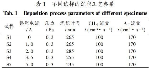 試驗用基體材料有(100)硅片(20mm*20mm)、40Cr鋼(15mm*15mm*5mm)和不銹鋼片(45mm*20mm),所沉積的三種薄膜試樣分別用于硬度、摩擦性能以及結合性能的分析。以純鉻(純度99%)和純鎢(純度99%)為靶材,以的氮氣和甲烷氣體為反應氣體,以99.99%的氬氣為濺射氣體,在圖1所示的裝置中進行非平衡磁控濺射。該裝置配有4個靶位和2個離子源,金屬鉻靶置于爐膛的左邊,鎢靶置于爐膛的右邊,基體經拋光和清洗后置于爐膛中間可旋轉的試樣架上,靶基間距約為60mm。沉積前,爐內先抽真空至110-3Pa,利用離子源離化的氬離子對基體表面進行轟擊,使其露出新鮮表面。沉積過程的工作壓力約為3*10-1Pa,基底偏壓為-100V。鍍膜過程中先沉積過渡層,鉻靶電流為3.5A,氮氣流量為30cm3*s-1,氬氣流量為120cm3*s-1,時間為10min;然后再沉積摻鎢的DLC膜,通過改變鎢靶電流來控制鎢含量,沉積參數見表1。