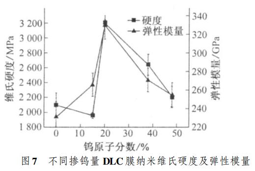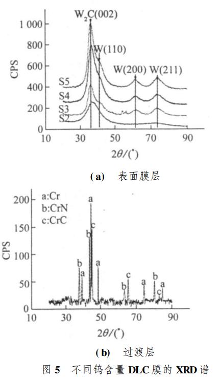 (1)用非平衡磁控濺射方法制備出摻鎢DLC膜中的鎢一部分與碳形成W2C微晶相,彌散分布在DLC膜中,提高了DLC膜的硬度。
