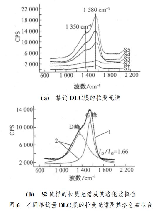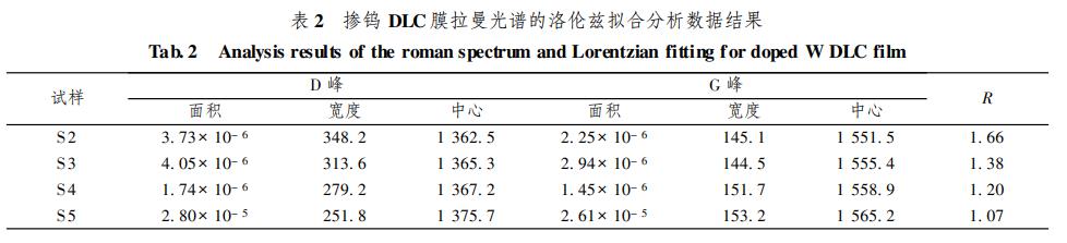 拉曼光譜是分析DLC膜結構較為常用的方法,能夠區分金剛石、石墨及不同結構的非晶碳成分。由圖6(a)可見,不同鎢含量DLC膜的拉曼光譜具有明顯的類金剛石譜線特征,即在1580cm-1附近有一寬展的G峰,在1350cm-1附近有一肩峰D峰,且非晶結構使譜線寬化,與文獻的報道一致。圖6(b)中曲線1為S2試樣的拉曼光譜,曲線2為利用洛倫茲擬合在700~2000cm-1范圍內對拉曼光譜進行解譜,得到兩個峰,即D峰和G峰,通過對D峰和G峰進行面積積分可得出兩峰的強度比值R,即R=ID/IG,R值表征了材料中碳的有序程度。一般認為R值愈大,碳的無序度愈小;R值愈小,碳的無序度愈大。由表2可以看出,隨著摻鎢量的增加,R的值由1.66下降到1.07,說明所制備DLC膜的碳無序度隨著鎢含量的增加而增大。其相對應的D峰中心位置也從低波數的1362.5cm-1上移到高波數的1375.7cm-1,移動了13.2cm-1,G峰中心位置也從低波數的1551.5cm-1上移到高波數的1565.2cm-1,移動了13.7cm-1。D峰和G峰向高波數段頻移說明了薄膜中的sp3結構增多,而sp2結構減少。這可能是膜層中鎢原子與碳原子結合生成W2C,使得膜層中sp3鍵的比例相對增大的緣故。