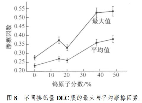 從圖8可看出,隨著摻鎢量的增加,平均摩擦因數由0.232上升到0.378,最大摩擦因數同平均摩擦因數變化趨勢一致,也即未摻雜DLC膜的摩擦因數低,摻雜鎢以后,DLC膜的摩擦因數增大;但當摻鎢量為20%時,其摩擦因數為0.26,仍具有較低的摩擦因數。DLC膜中石墨相的潤滑保證了膜的低摩擦因數,通過調整膜中的摻鎢量可使膜中石墨相與金剛石的相對比例發生變化,隨著摻鎢量的增加,薄膜中形成的W2C微晶彌散在膜中,有利于提高膜的摩擦性能。當摻鎢量達20%左右,膜中彌散的W2C微晶達到飽和,此時膜自潤滑性能達到最佳,摩擦因數最小;同時隨著摻鎢量的增加,相應的碳含量略有減少,類金剛石膜中碳量較少則石墨相也相應減少,膜相對應的摩擦因數也略有增加。