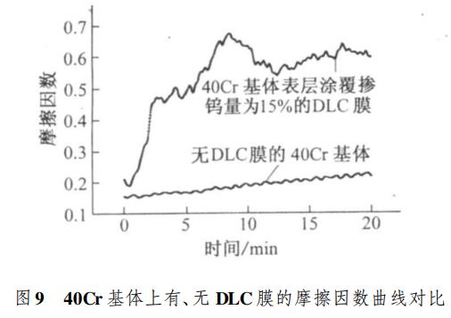 由圖9可見,未沉積DLC膜的40Cr基體的摩擦因數隨時間的變化幅度較大,且其摩擦因數也較大,最大為0.68左右;沉積DLC膜后,其摩擦因數隨時間的變化較為平緩,一般維持在0.2~0.3之間,說明所制備的摻鎢DLC膜具有優異的摩擦性能。