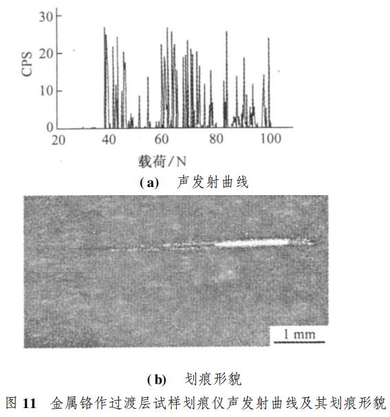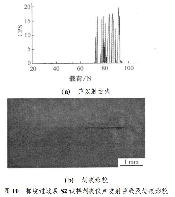 由圖10和圖11可以看出,采用梯度過渡層的S2試樣,當載荷小于70N時劃痕邊緣沒有崩膜,至載荷為72N時,其聲信號明顯增強,開始出現膜脫落現象,裸露出基體;而直接采用金屬鉻作過渡層的試樣,當加載到41N時就開始出現膜脫落現象,至70N時膜已全部脫落,露出白色基體,說明采用梯度過渡層所制備的DLC膜與基體的結合強度比單純用鉻作為過渡層制備的膜的結合強度大。