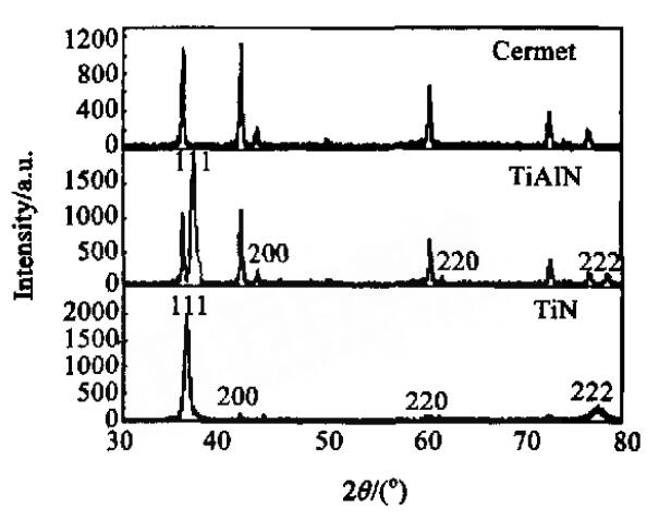 2)金屬陶瓷基體多弧離子鍍后涂層最表層為TiN,中間層主要為TiAlN,基體金屬陶瓷主要為Ti(C,N)和Ni。TiN相和TiAlN相均存在強(qiáng)烈的(111)擇優(yōu)取向。
