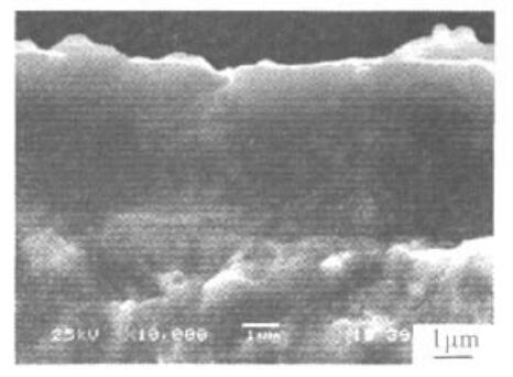 圖4所示為金屬陶瓷多弧離子鍍TiN/TiAlN后的斷口組織形貌。由圖4可見,TiN/TiAlN組織均勻,涂層與基體之間沒有剝離現(xiàn)象。測(cè)試結(jié)果表明,TiN/TiAlN鍍層厚度約為3um。
