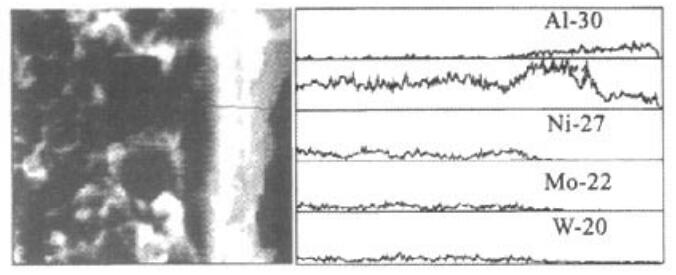 圖5為材料斷面從基體到涂層的各主要元素的線分布。由圖5可見,Al的含量從涂層內(nèi)部到表面逐漸增大,呈現(xiàn)梯度分布特征。