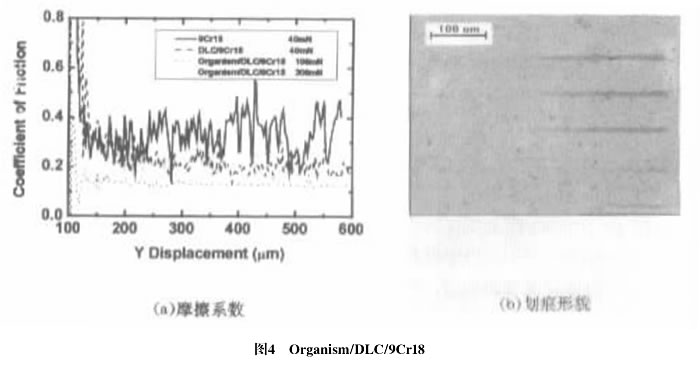 在圖4a中,9Cr18和DLC/9Cr18的摩擦系數(最大法向載荷為40mN)約分別為0.35和0.2,Organism/DLC/9Cr18的摩擦系數(最大法向載荷為100mN,對應圖4b中下面第二條劃痕)為0.15,固體潤滑效果明顯,當最大法向載荷為300mN時,Organism/DLC/9Cr18在100um~200um范圍內的摩擦系數較穩定,約為0.15,說明壓針在Organism/DLC中刻劃,隨后,摩擦系數逐漸變大,說明壓針劃到基體,摩擦系數最終接近基體的摩擦系數,對應圖4b中上面第三條劃痕,從劃痕顯微照片和摩擦曲線對比發現,摩擦系數開始變大對應于殘余劃痕的起點,說明壓針劃入軟基體,有殘余劃痕存在。